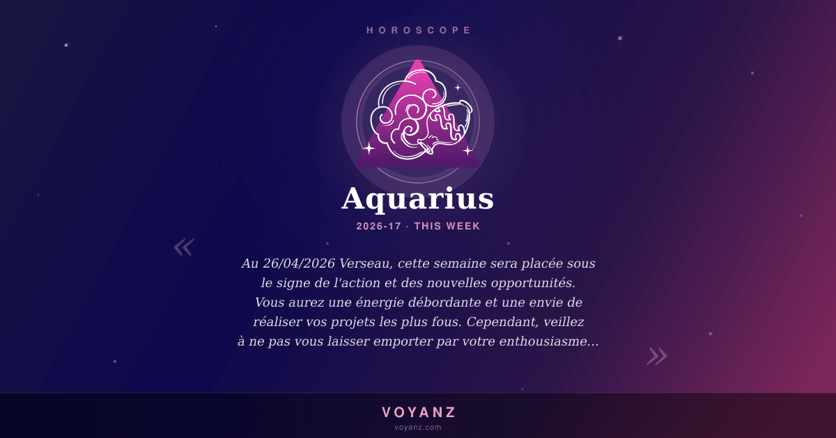 Verseau, cette semaine sera placée sous le signe de l'action et des nouvelles opportunités. Vous aurez une énergie débordante et une envie de réaliser vos projets les plus fous. Cependant, veillez à ne pas vous laisser emporter par votre enthousiasme et à garder une certaine organisation pour mener à bien vos actions.