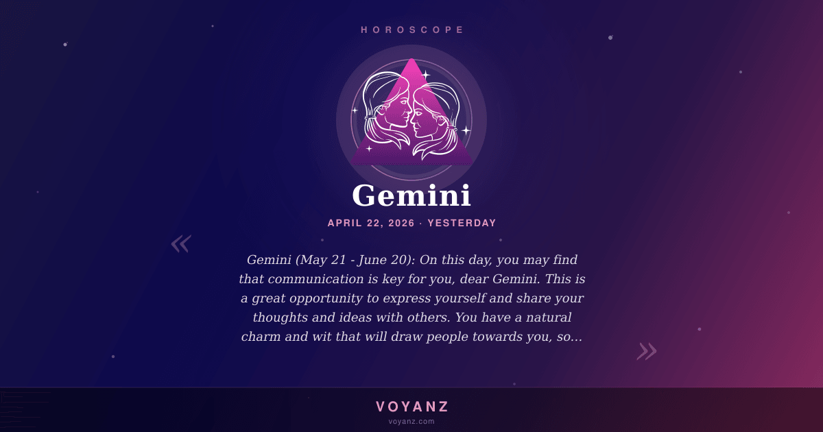 Gemini (May 21 - June 20): On this day, you may find that communication is key for you, dear Gemini. This is a great opportunity to express yourself and share your thoughts and ideas with others. You have a natural charm and wit that will draw people towards you, so don't be afraid to speak up and make yourself known. Your sign is ruled by Mercury, the planet of communication, so use this energy to your advantage. This is also a great day to network and make new connections. Your curiosity and adaptability will serve you well in any social setting. Take the opportunity to learn something new from those around you. Your quick thinking and ability to see both sides of a situation will also come in handy. Embrace this day with an open mind and a willingness to learn, and you will be rewarded.