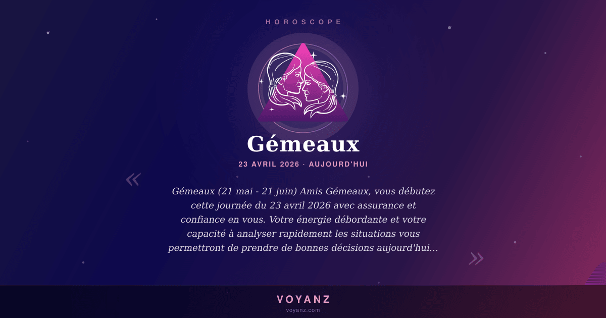 Amis Gémeaux, vous débutez cette journée du 23 avril 2026 avec assurance et confiance en vous. Votre énergie débordante et votre capacité à analyser rapidement les situations vous permettront de prendre de bonnes décisions aujourd'hui. Profitez-en pour avancer dans vos projets et relever de nouveaux défis.