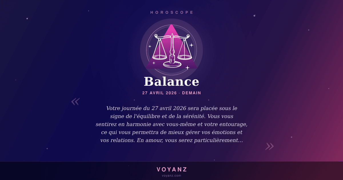 En résumé, chère Balance, cette journée du 27 avril 2026 sera placée sous de bons auspices pour vous. Profitez de cette harmonie et de cet équilibre pour avancer