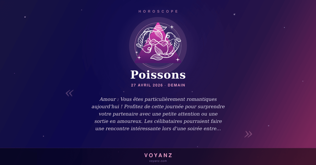 Amour : Vous êtes particulièrement romantiques aujourd'hui ! Profitez de cette journée pour surprendre votre partenaire avec une petite attention ou une sortie en amoureux. Les célibataires pourraient faire une rencontre intéressante lors d'une soirée entre amis.