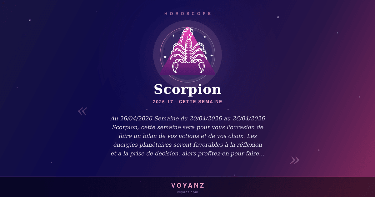 Scorpion, cette semaine sera pour vous l'occasion de faire un bilan de vos actions et de vos choix. Les énergies planétaires seront favorables à la réflexion et à la prise de décision, alors profitez-en pour faire le point sur votre vie et pour prendre les bonnes décisions.